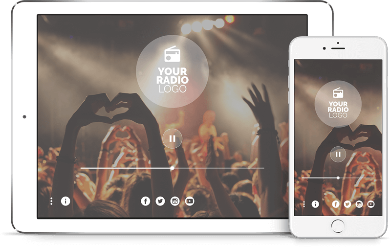 The apps will have your radio station logo, a PLAY/PAUSE key, volumen control, links to your social media and playback background.